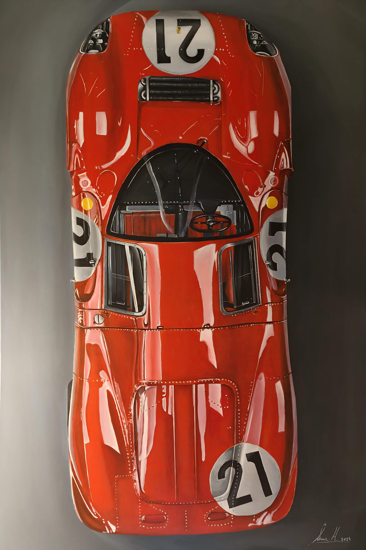 Concept Statement This painting pays homage to the Ferrari 330 P4, a legend of endurance racing and one of the most admired designs in motorsport. Ana Herrero portrays the car with epic solemnity: its sculpted curves and luminous red bodywork resonate as both machine and myth.