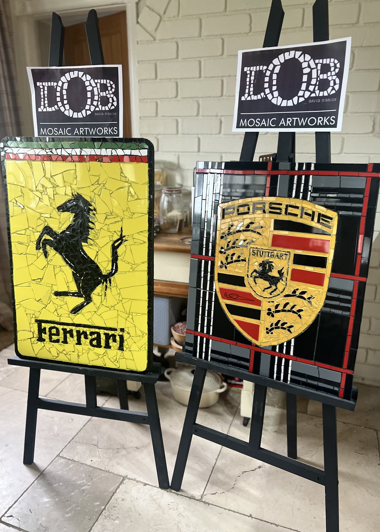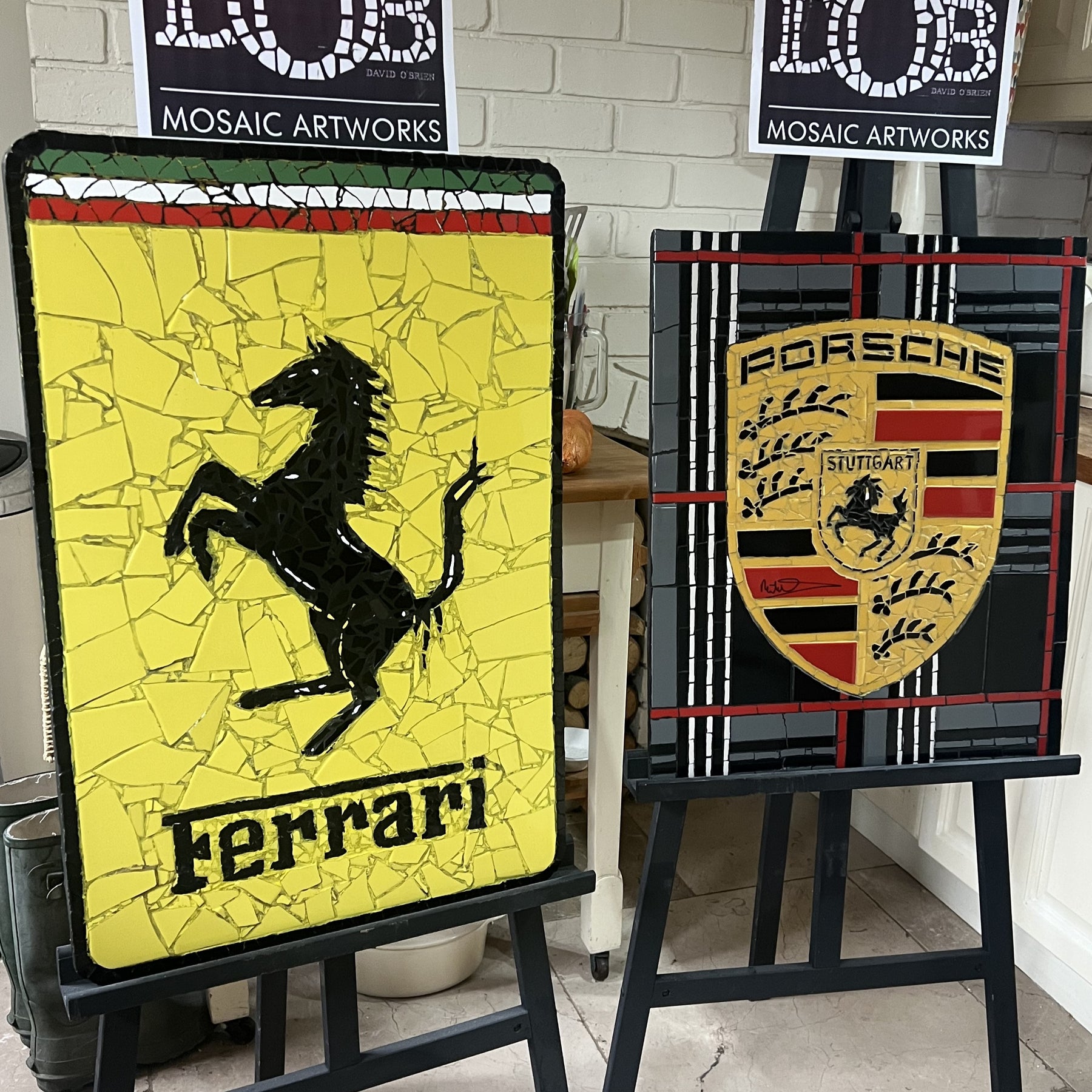 Two handcrafted ceramic mosaic wall artworks featuring Ferrari and Porsche badges, created as bespoke commissions. Each piece is made from hand-cut ceramic tiles in yellow, red, black, white, and grey, celebrating classic motorsport design and automotive heritage through contemporary mosaic craftsmanship.
