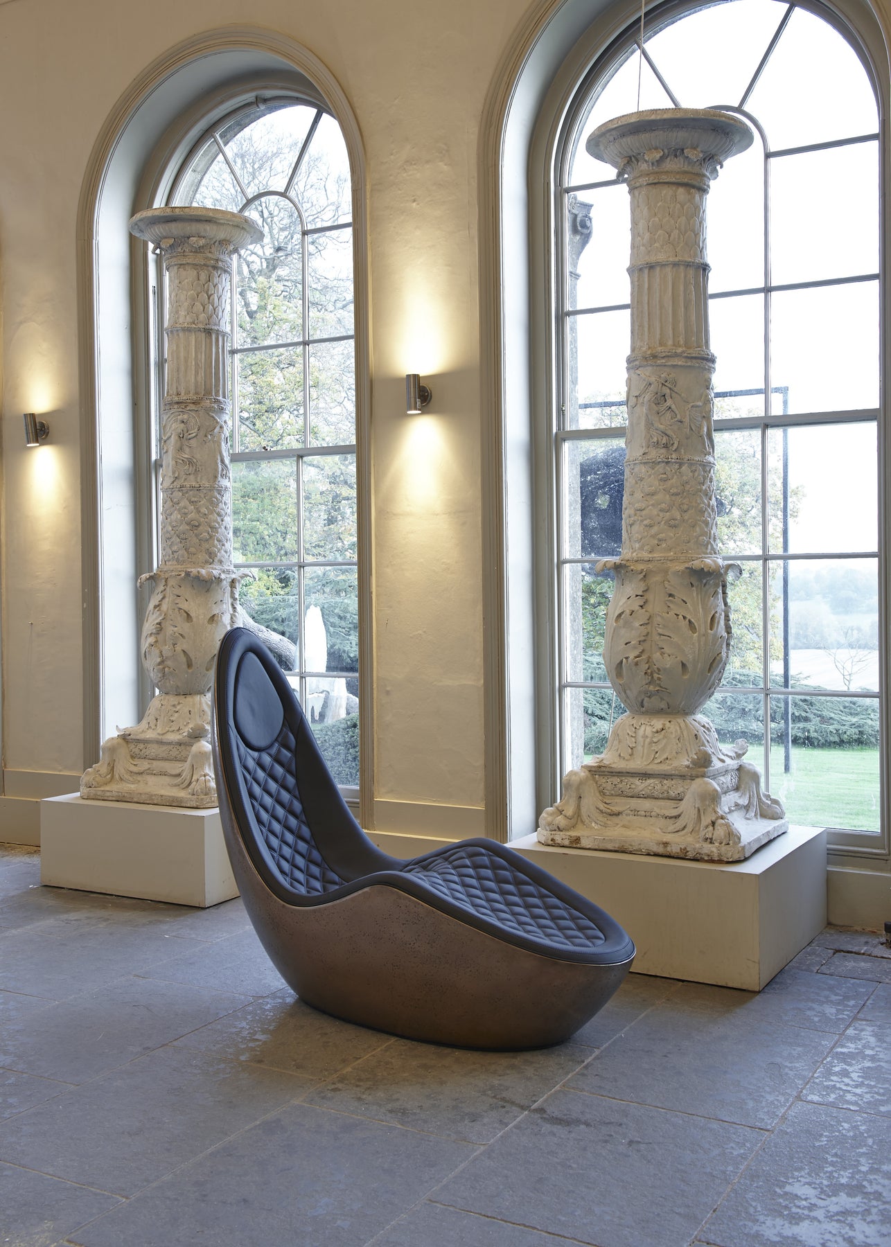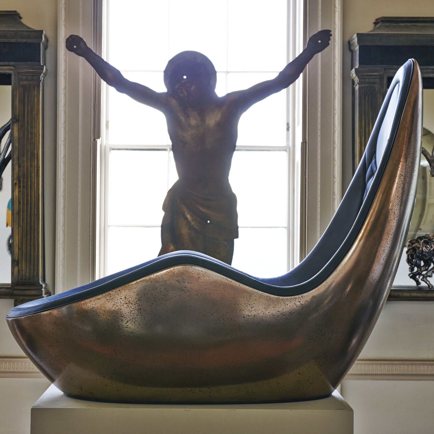 “Caillou Chaise – Leather & Bronze” by Ben Rousseau – a sculptural chaise combining deep navy quilted leather with a liquid bronze base. A handcrafted fusion of strength and sophistication, redefining modern luxury furniture.