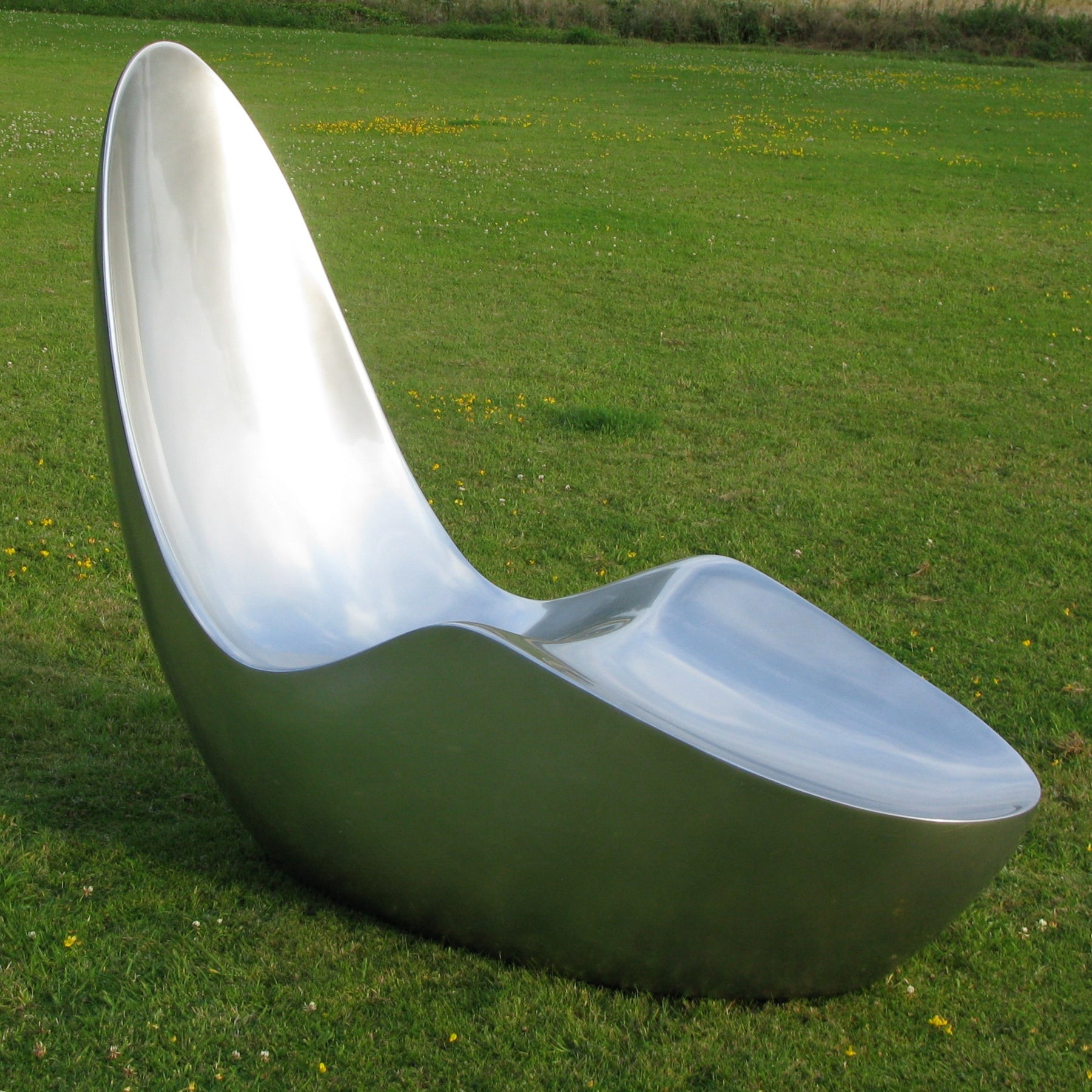 “Caillou Chaise – Metallic Wet Spray” by Ben Rousseau – a sculptural chaise inspired by 1960s grand tourers, hand-shaped in composite with a high-gloss metallic lacquered finish in white, lime, gold, or silver. A fusion of luxury design and form.