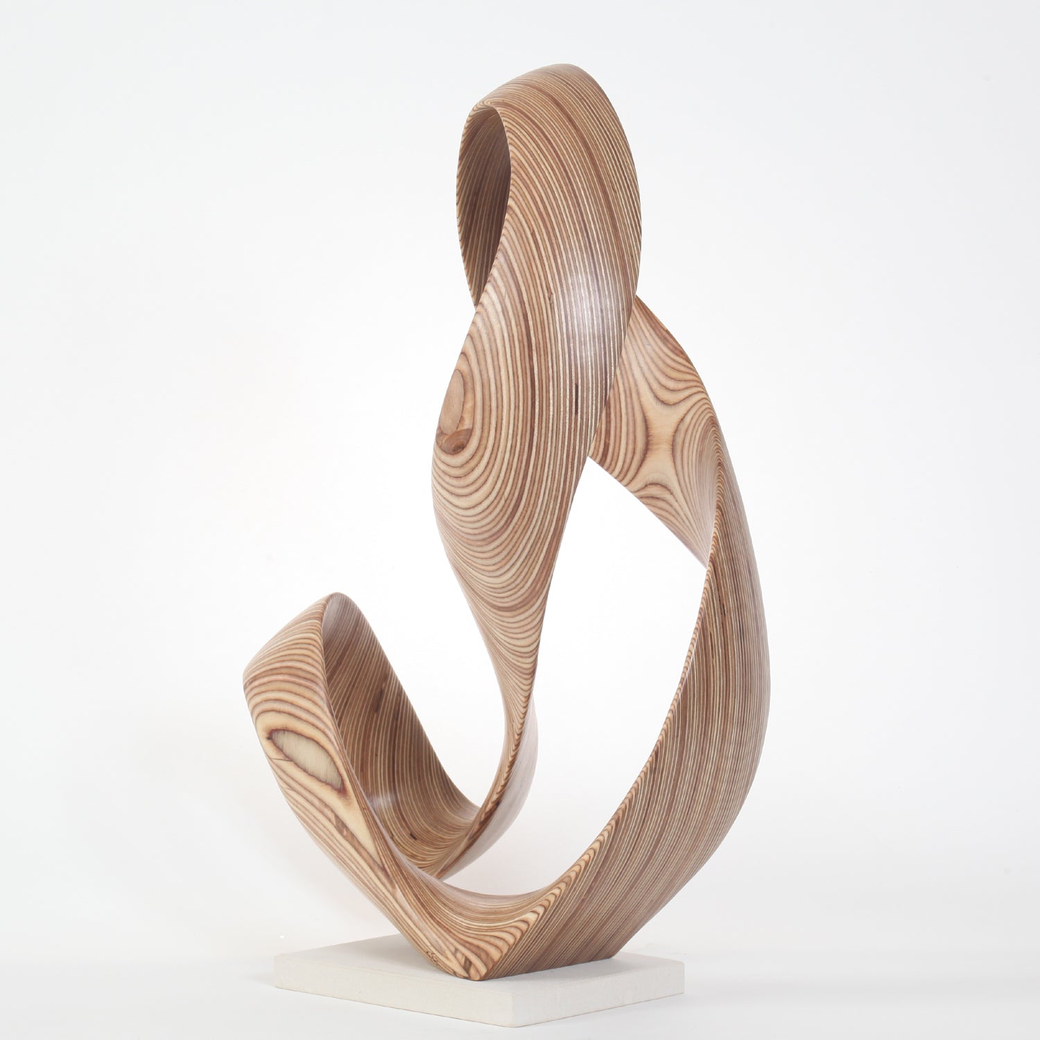 Hand-carved birch plywood sculpture by Bill Prickett, formed as a flowing Möbius-style infinity loop inspired by an ampersand, with continuous twisting curves, visible layered grain, and a balanced sculptural presence on a white base.