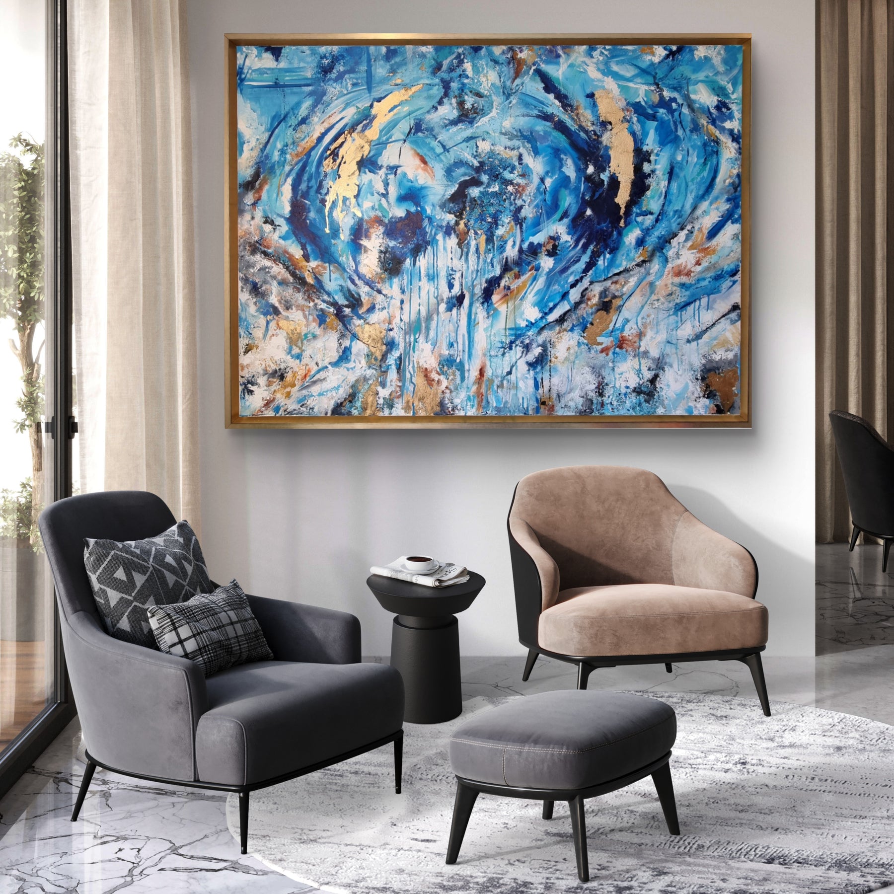 Highly textured blue and gold abstract painting with sweeping circular motion, cascading drips and layered brushstrokes, evoking water, movement and freedom, framed in a gold tray frame.