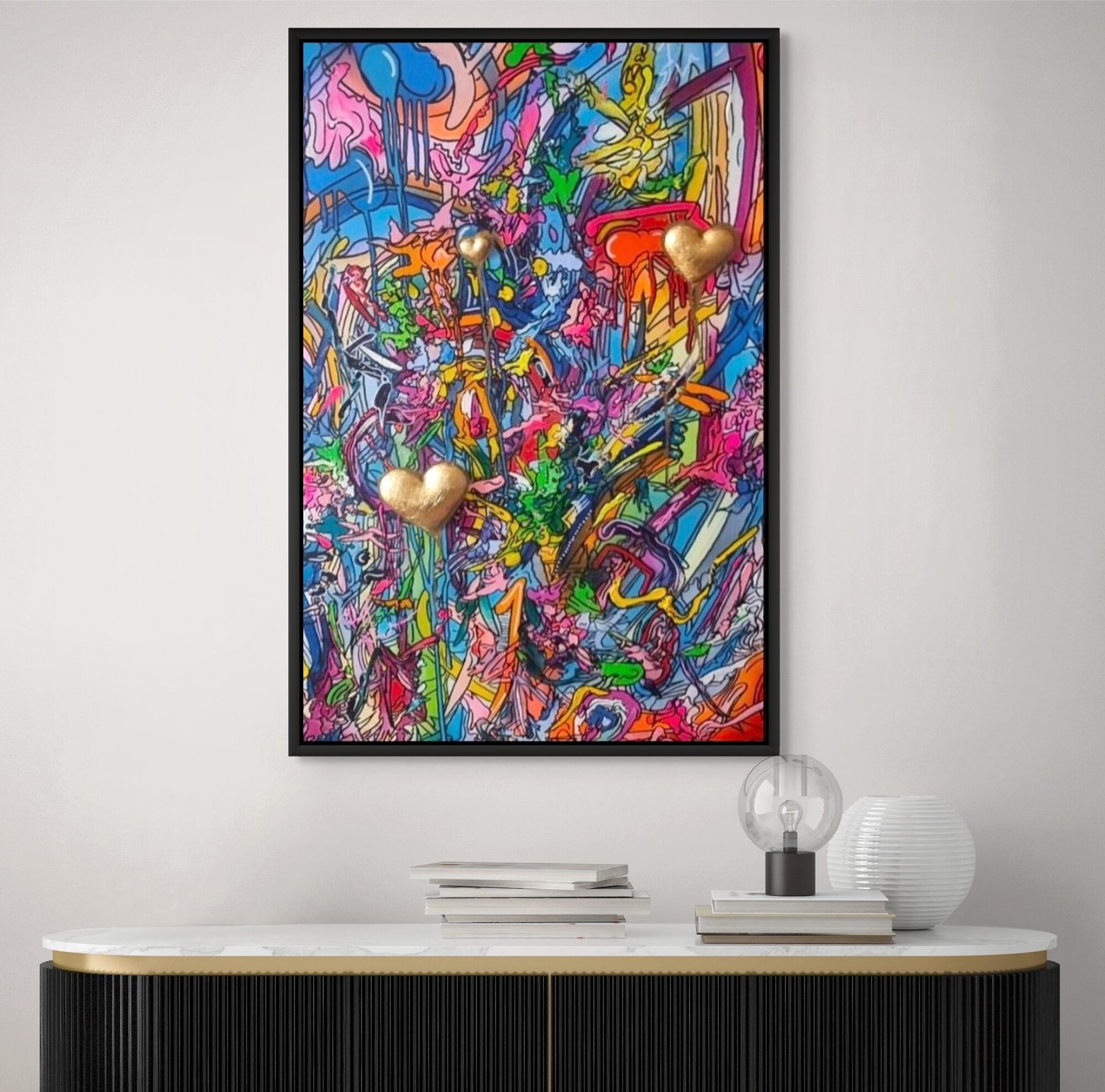 A vibrant mixed-media abstract artwork filled with layered graffiti-style lines, drips and splashes in bright pinks, blues, yellows and greens, featuring three raised gold 3D heart elements floating within the composition, framed in a black tray frame.