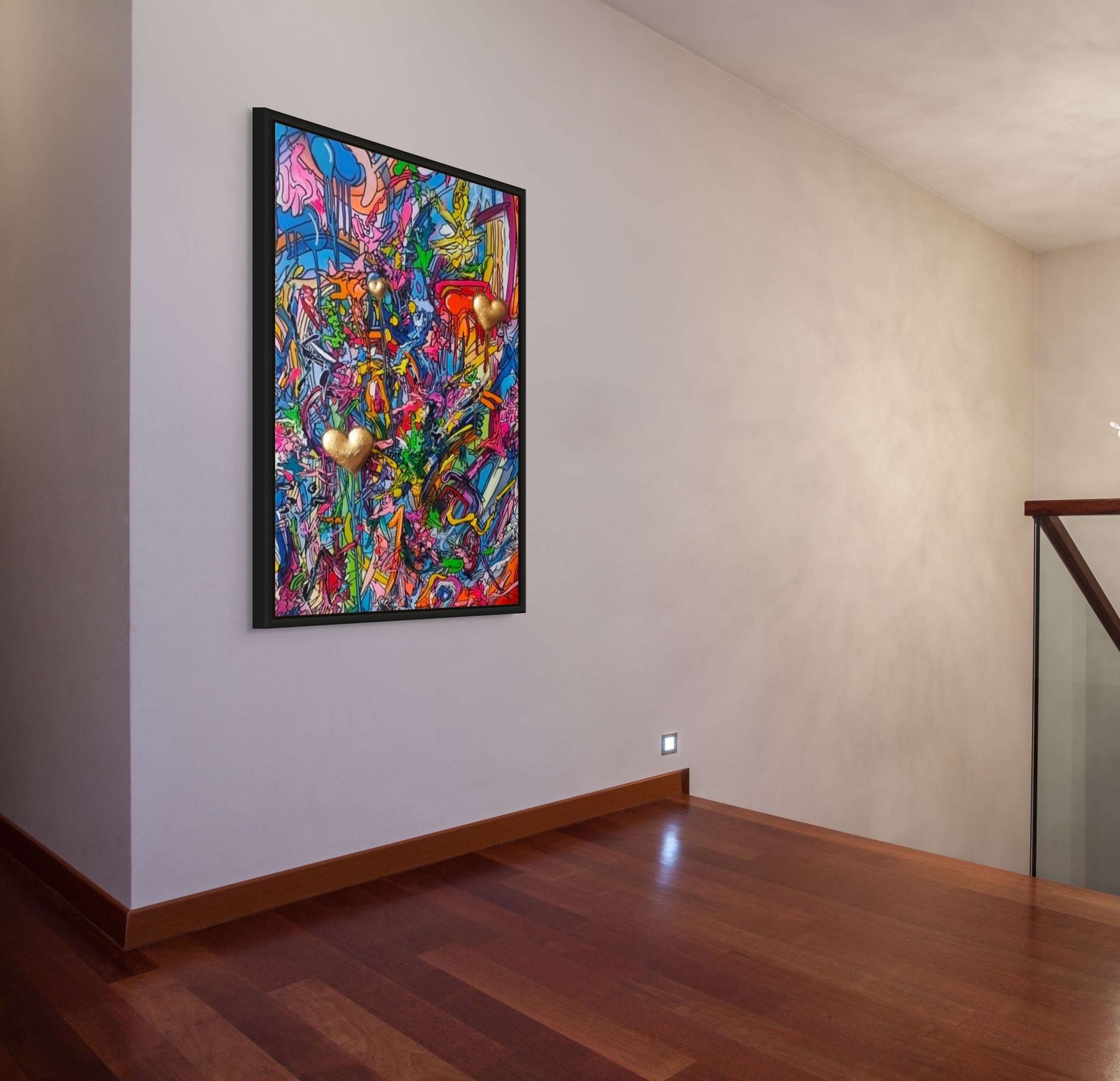 A true statement for the people who love to live life to the full. This piece combines 2D a 3D art. With three stunning 3D gold hearts floating into the sky like balloons; it’s about having fun, embracing life and spreading good vibes. Part of my ‘Abstreet’ Collection that combines abstract and graffiti to create bold original paintings.