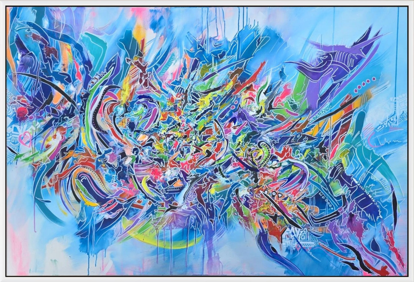 Vibrant large-scale abstract graffiti painting bursting with layered colour, bold sweeping lines and dynamic shapes against a bright blue background, framed in a white tray frame.