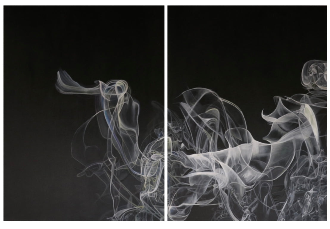 Painted in oil on Italian linen, the composition unfolds across two panels, allowing space and pause to act as part of the rhythm. Smoke-like forms drift and coil against a deep black ground, suggesting breath, vibration, and the momentary presence of sound. Within these pale, luminous trails are two hidden ink poems, woven subtly into the smoke itself - revealed only through close, patient looking.