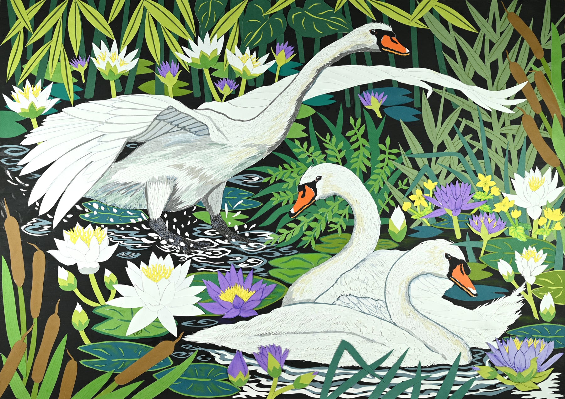 Gliding Swans captures a calm yet dynamic moment as three swans move through a dense water garden of lilies, reeds and summer foliage. Fiona Scott-Wilson’s hand-cut technique gives each ripple, feather and leaf a crisp definition, creating a sense of movement that feels both natural and composed.
