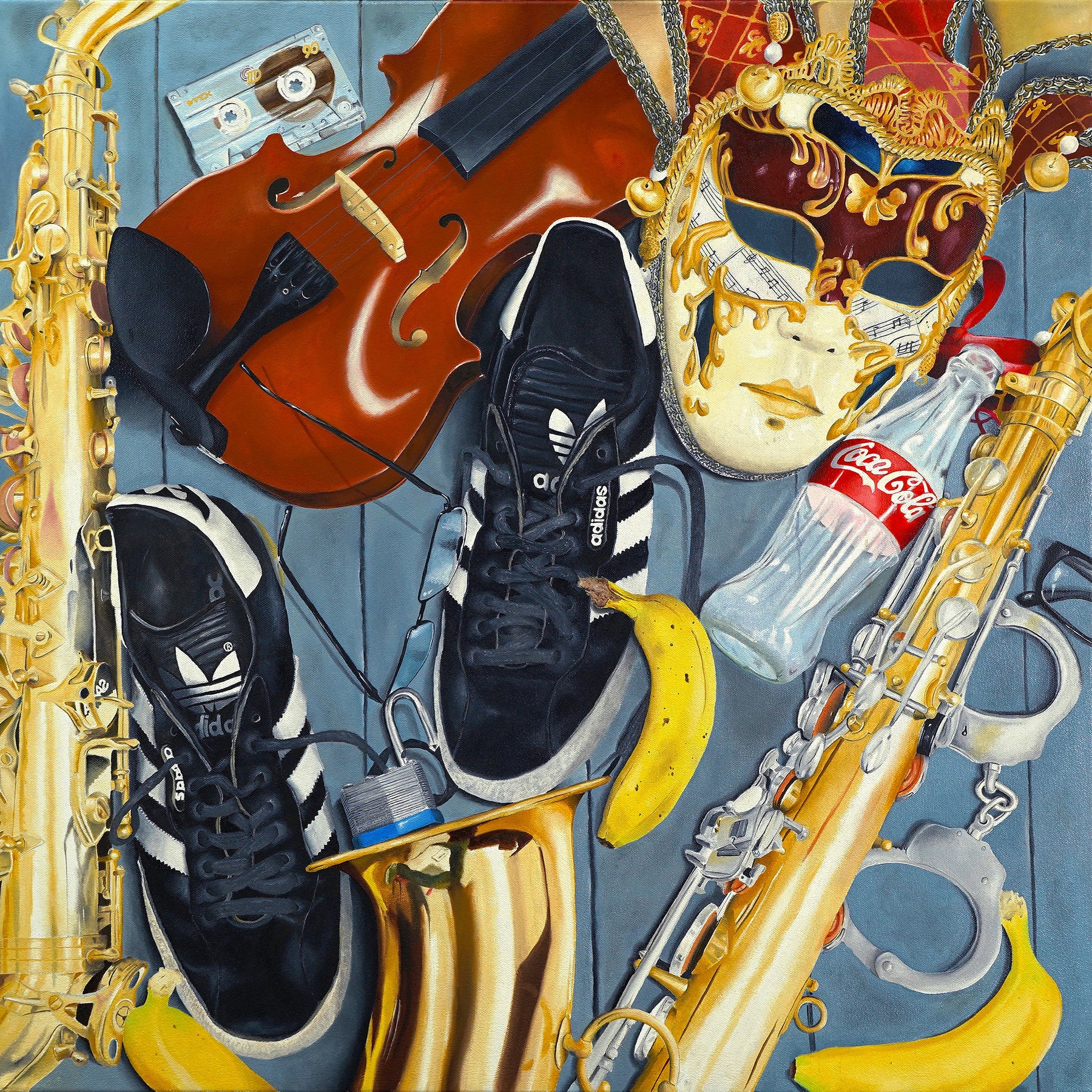 A highly detailed still-life oil painting featuring black Adidas trainers, a Venetian-style mask, saxophones, a violin, a glass Coca-Cola bottle, bananas, a cassette tape, and metal handcuffs arranged in a dense composition with reflective brass, polished wood, textured leather, and bright colour accents.