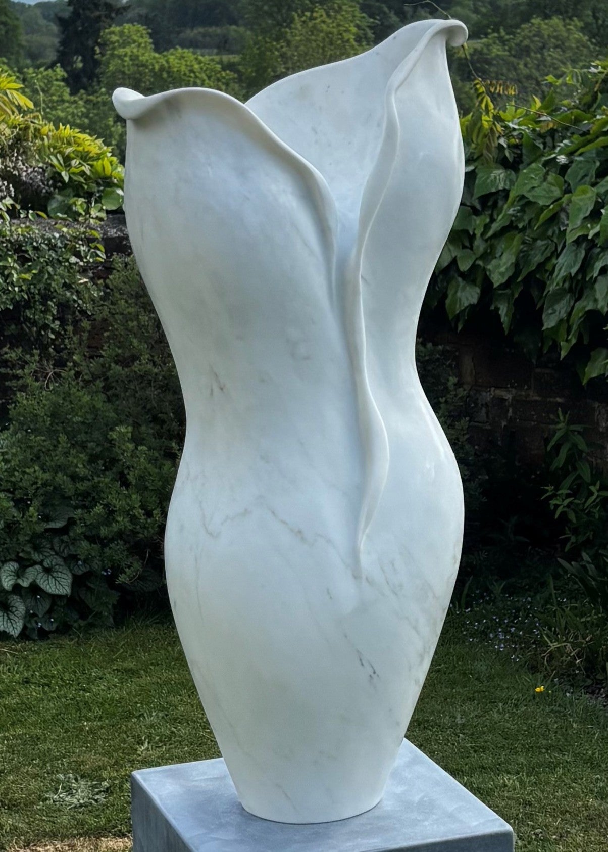 Elegant outdoor marble sculpture titled “Petali” by Lucy Unwin, hand-carved from luminous white Carrara marble with delicate petal-like curves and fluid organic lines, standing gracefully on a smooth stone plinth against a natural garden backdrop.