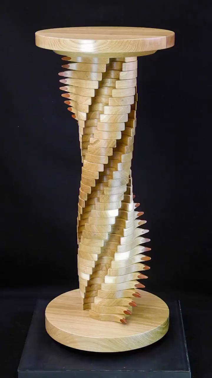 Lacuna Table 2 by Max McCance — a one-off sculptural table in oak and mahogany with a twisting double-helix column and sharp mahogany points spiralling upward beneath a round oak top and base.