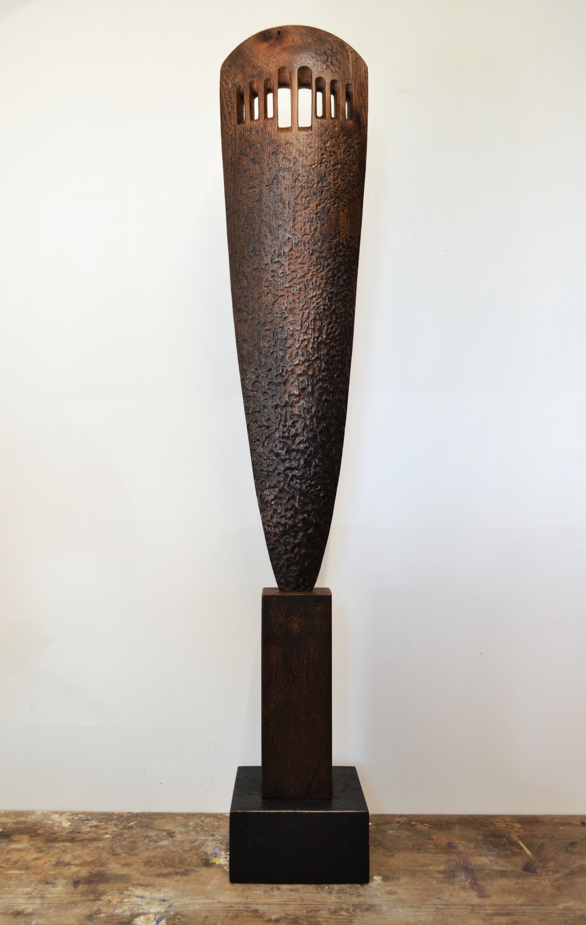 This tall, elegant sculpture in elm - mounted on an oak base - is carved in the form of a stone-age axe: a shape rooted in assertion and endurance. But within that form lies a subtle narrative of duality. The textured surface evokes turbulent terrain, a visual language of war and conflict; while the upper “visor” section, pierced with slender windows, offers the promise of light, of peace emerging above the tumult.