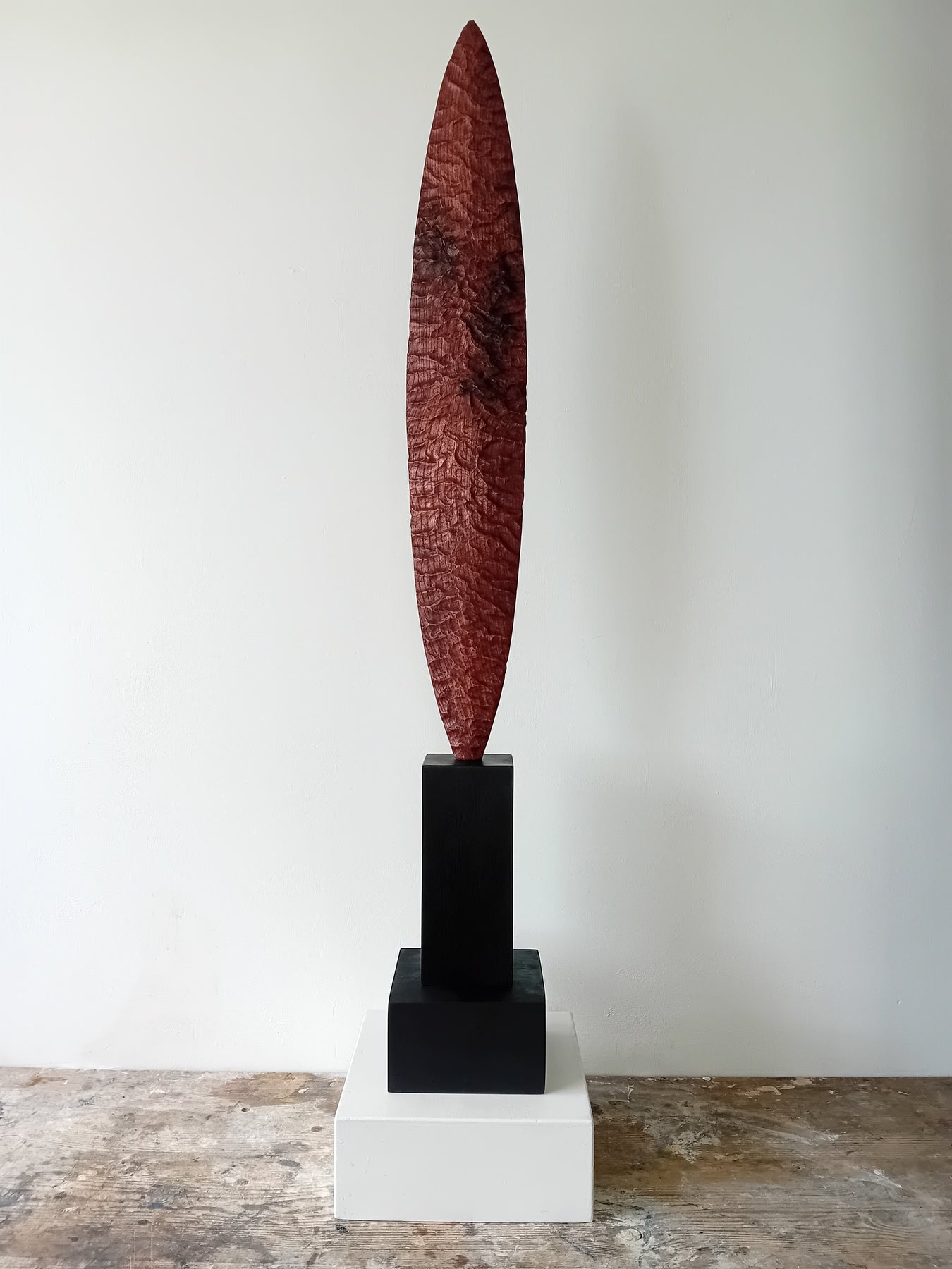 Blade by Nicola Beattie – a tall, slender, hand-carved elm sculpture with an elongated leaf-like or blade-shaped form. The surface is deeply textured with rhythmic chisel marks, finished in rich reddish-brown tones with areas of darker burnished grain and natural patterning. Mounted on a tall black rectangular base atop a square plinth, the piece stands vertically like a minimalist totem. Its organic contours and refined symmetry evoke ancient tools or ceremonial artefacts, blending contemporary abstraction