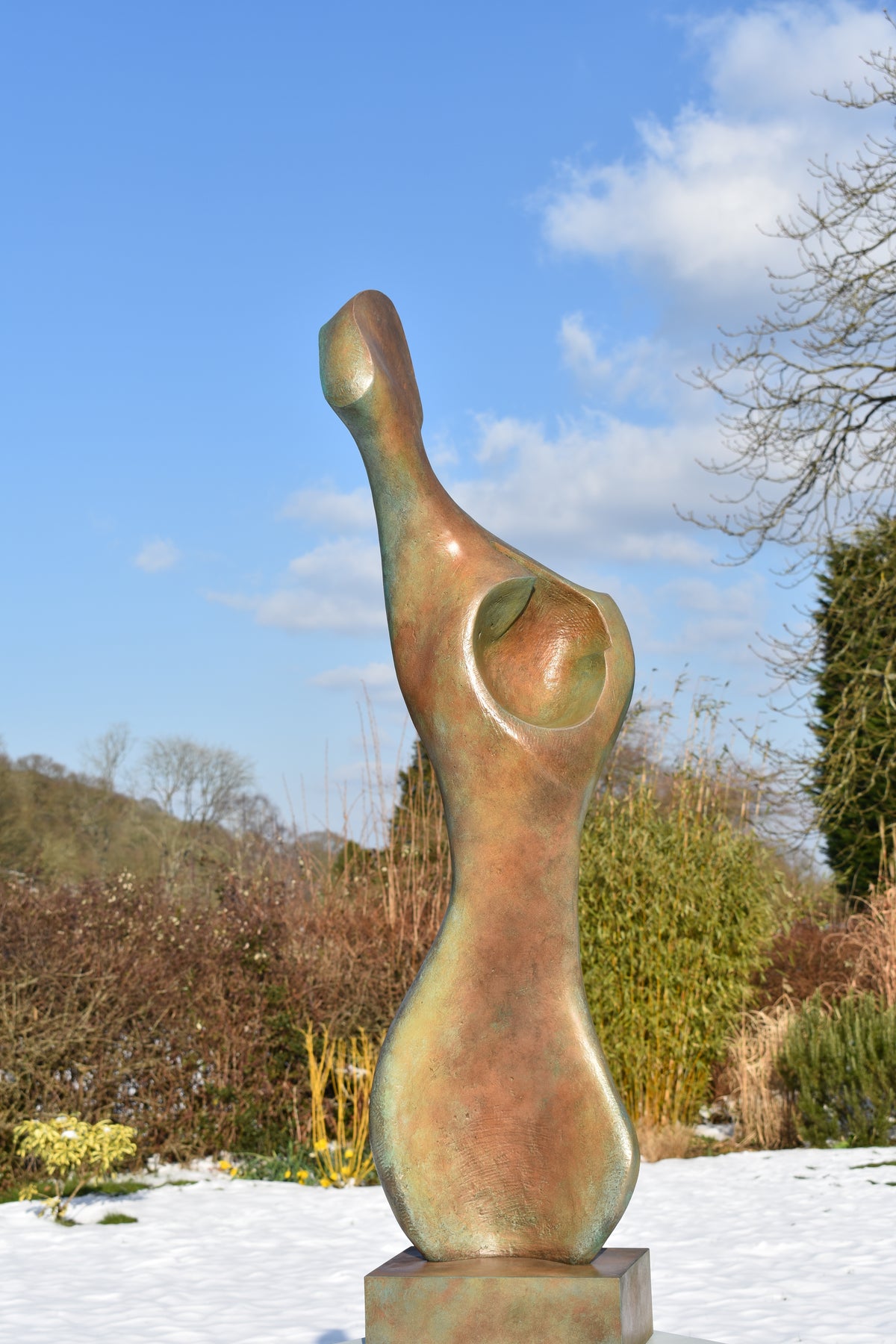 Bone Form IV — abstract bronze sculpture by Nicola Godden inspired by the natural curves and hollows of animal bone. The piece has a tall, sinuous form with a hollowed centre, organic surface texture and warm bronze patina shifting from earthy brown to soft green and gold highlights. Displayed outdoors on a one-metre timber plinth against a bright blue sky and winter landscape.