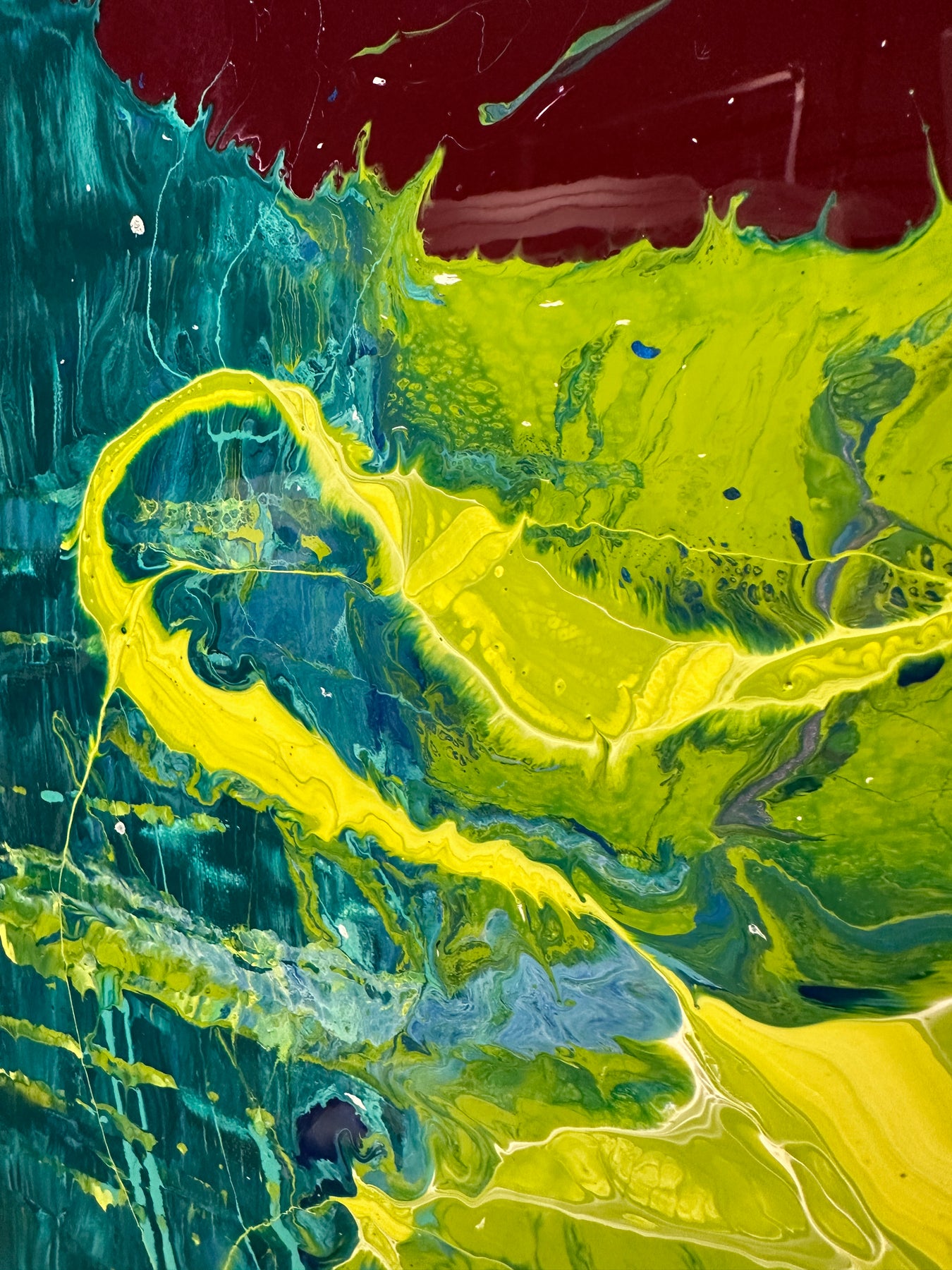 I made a video of the whole painting being made which you can watch below on YouTube. The canvas was laid flat to begin with and the first waves of paint were applied with a wide window squeegee. After getting a base I was happy with I moved on to the grand gestures that make up the top layers. These are a combination red, orange, burgundy, blue and lime green. There’s also a touch of black in there too just to add a little grounding to the painting.