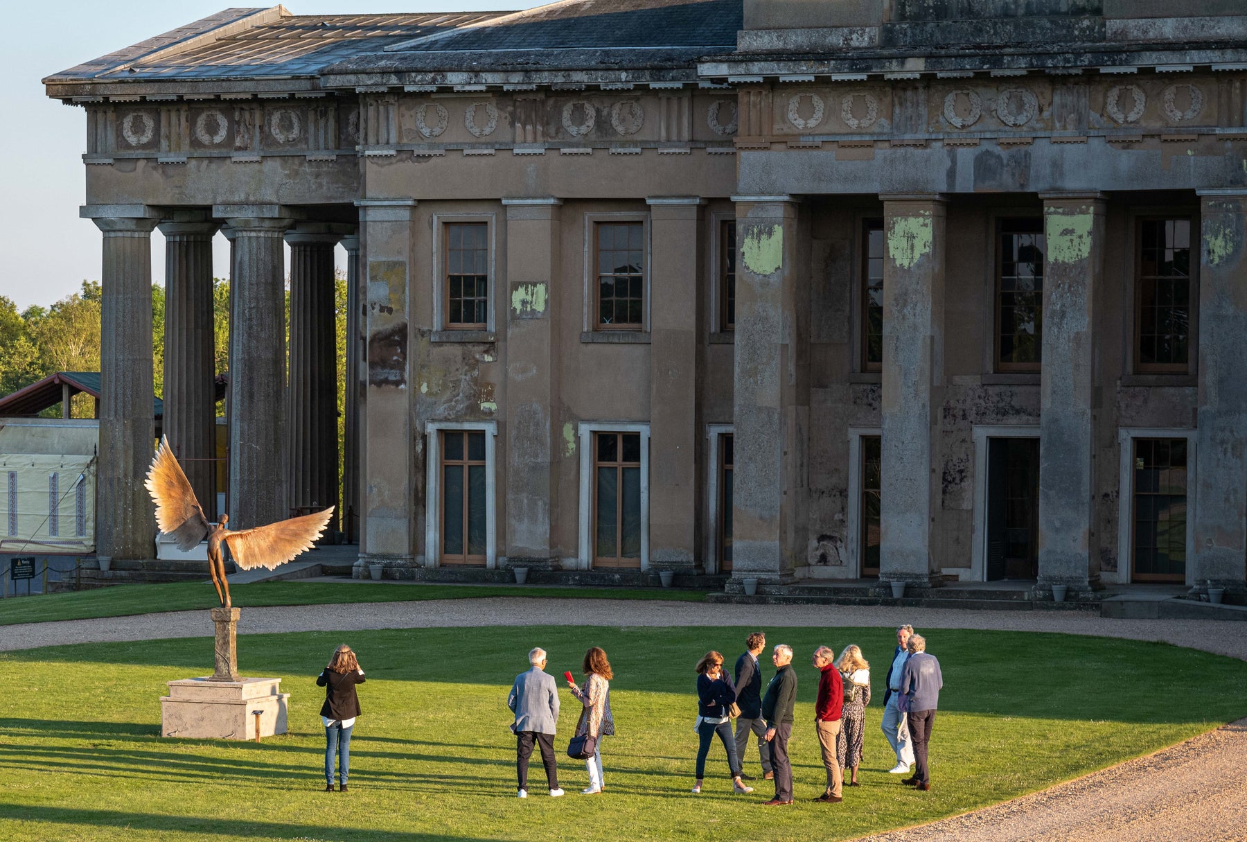 Icarus I — monumental bronze sculpture by Nicola Godden, depicting a stylised male figure with immense outstretched wings, leaning forward as if preparing for flight. Rich bronze patina with warm coppery browns fading into lighter golden tips across the feathered wings. Originally featured at the London 2012 Olympic Village and sold at Sotheby’s. Set outdoors against a clear blue sky and classical architectural backdrop.