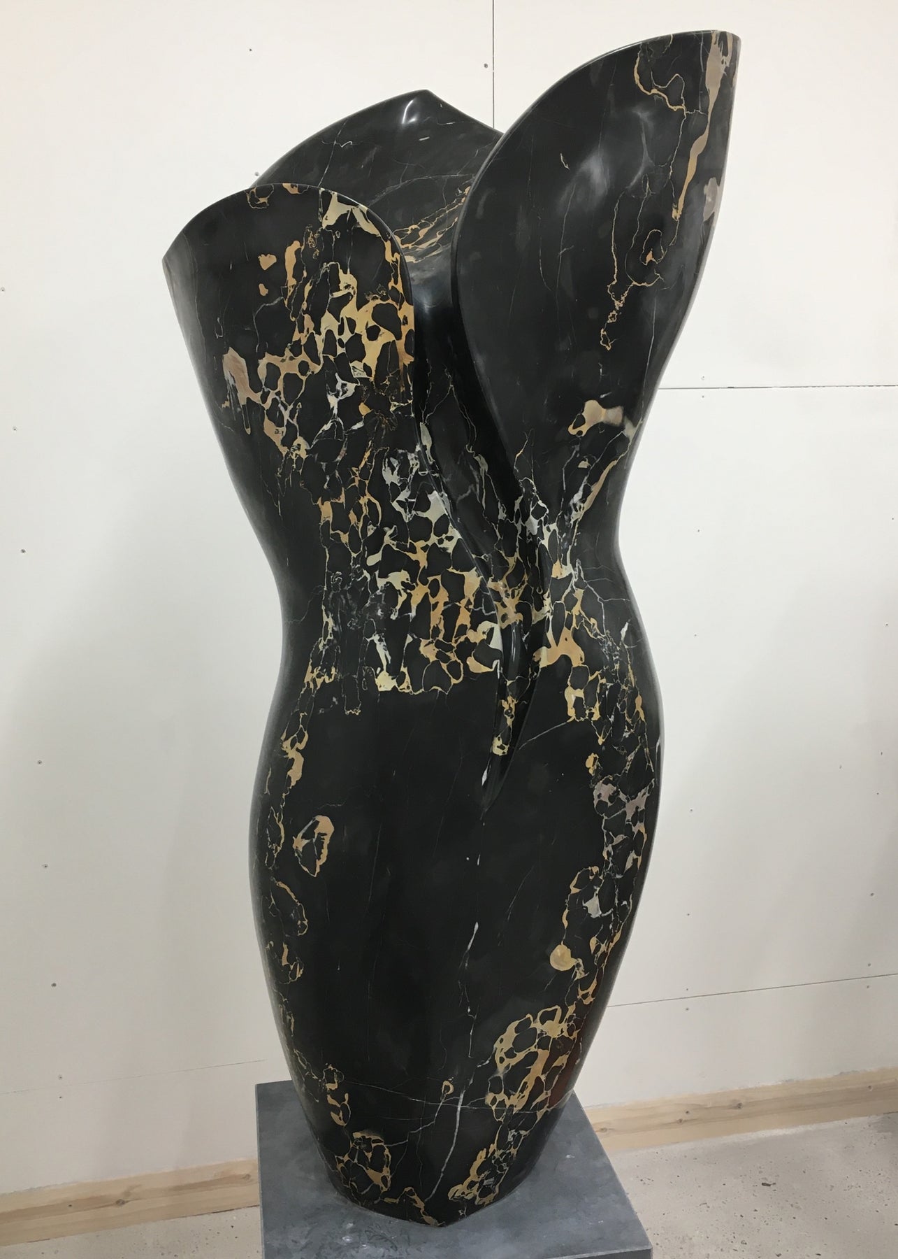 Large contemporary sculpture carved from luxurious Portoro marble, its tall, feminine form flowing with soft curves and dramatic black surface veined with striking gold and ivory patterns, standing on a solid stone plinth.