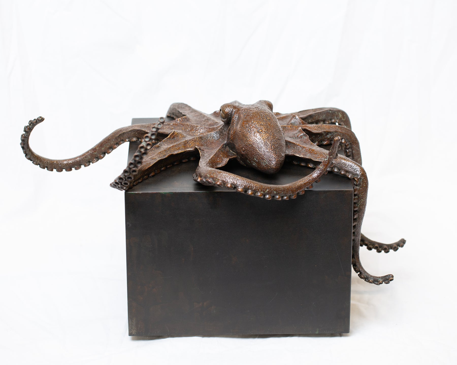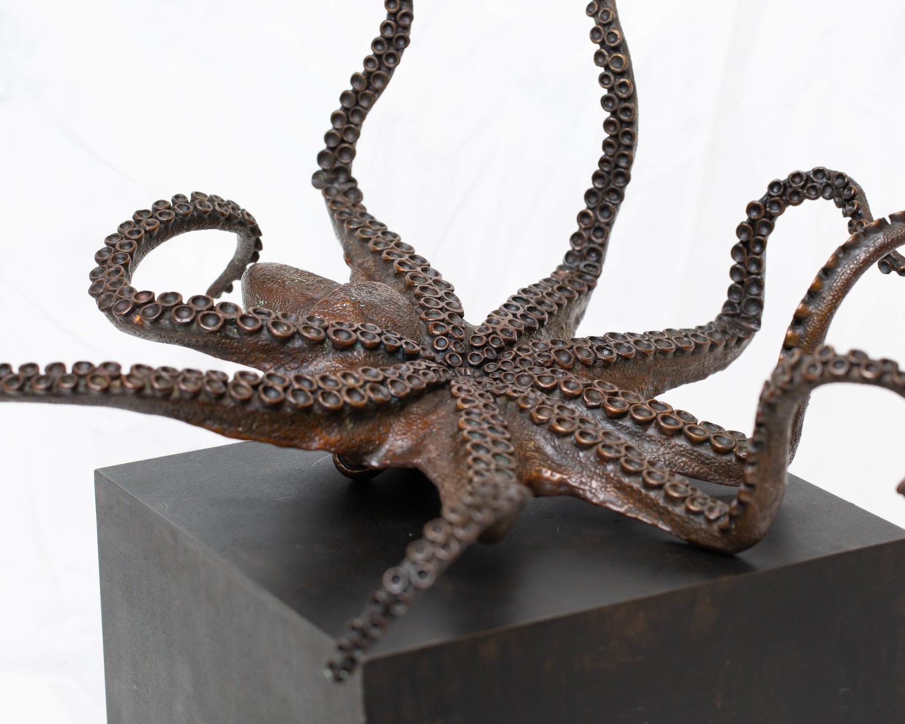 Octopus bronze sculpture by Tom Saxton draped across a dark patinated steel cube plinth, stylised marine creature with flowing tentacles in rich dark bronze and warm copper-brown tones, contemporary ocean wildlife bronze artwork