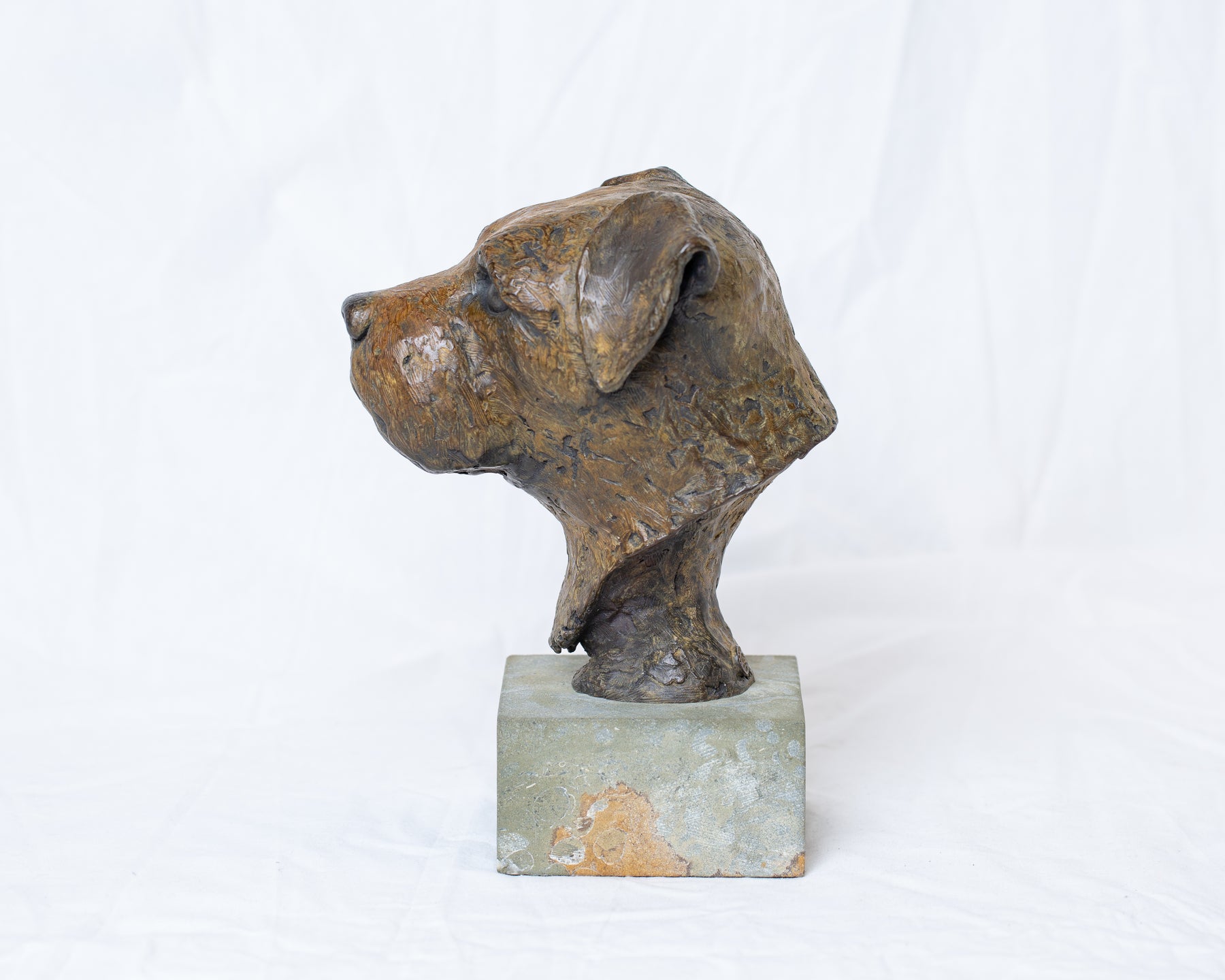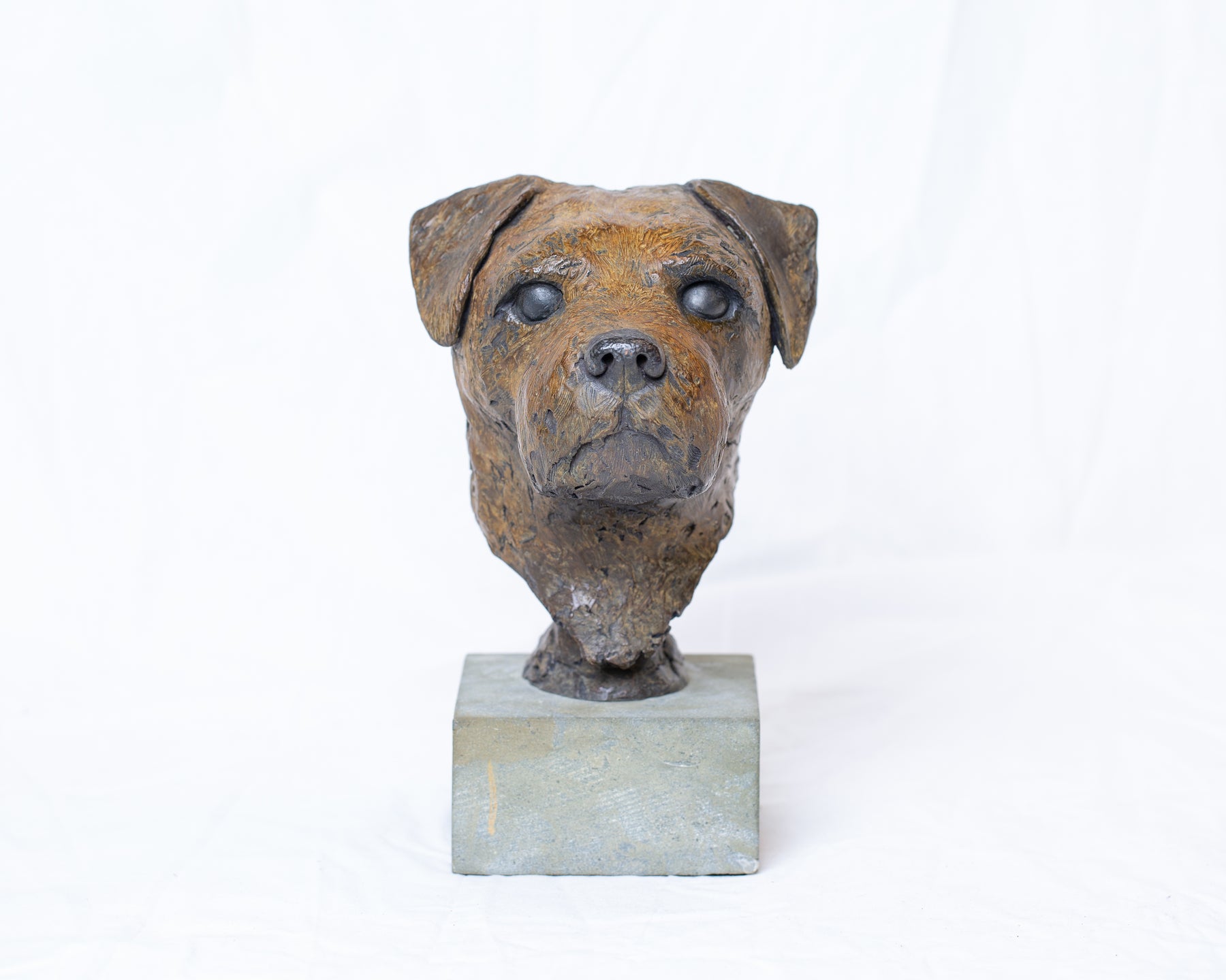 Sidney Border Terrier bronze sculpture by Tom Saxton mounted on a Cotswold stone plinth, expressive dog portrait bust with textured fur in warm copper-brown and dark bronze tones, contemporary canine bronze sculpture